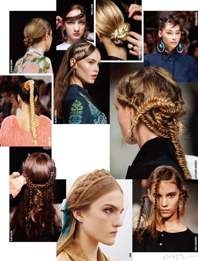 이번 시즌 브레이드 헤어가 귀환했다. 다양한 컬렉션 모델들이 곱게 땋은 브레이드를 하고 런웨이를 장악한 것. 리처트퀸과 크리스찬시리아노 쇼는 로 브레이드 번 스타일을, 마크패스트 컬렉션은 정수리를 향해 한껏 높이 올려 묶은 하이 브레이드를 선보였다. 디올 쇼는 브레이드 헤어를 머리띠처럼 표현했고, 조르지오아르마니는 디스코 땋기를 한 다음 여러 번 꼬아 올린 트위스트 번인 일명 '뿌까 머리’를 완성했으며, 요지야마모토 쇼에서는 브레이드를 불규칙하게 땋아 위트를 더했다. 이처럼 브레이드 헤어의 매력은 다양한 분위기를 연출할 수 있다는 것에 있다. 에이바이봄 박민경 실장은 "브레이드 헤어는 어디에서 가르마를 타서 시작하느냐, 얼마나 팽팽하게 혹은 느슨하게 묶느냐에 따라 180도 다른 이미지를 연출할 수 있는 마법 같은 헤어스타일"이라고 설명했다.