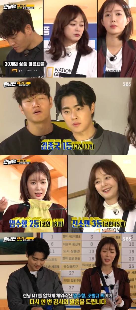 최종 결과 김종국이 1등을 차지했다. 2등, 3등을 한 임수향, 전소민까지 상품을 받게 됐다. 꼴찌는 지석진이었다. 임수향은 멤버들 사인이 담긴 이름표를 뽑았다. 임수향은 "요리 시키더니"라며 이름표를 던져 웃음을 안겼다. 전소민이 뽑은 상품은 에어프라이어. 지석진은 오디오 벌칙을 받게 됐다.