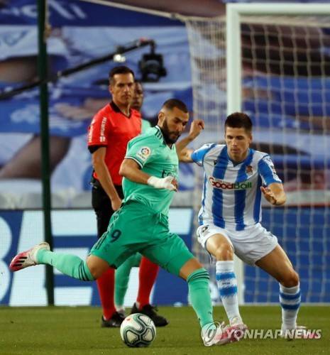 epa08501165 Real Madrid's Karim Benzema (C) in action against Real Sociedad's Igor Zubeldia (R) during the Spanish LaLiga soccer match Real Sociedad vs Real Madrid played at Real Arena stadium in San Sebastian, Basque Country, Spain, 21 June 2020. EPA/Juan Herrero