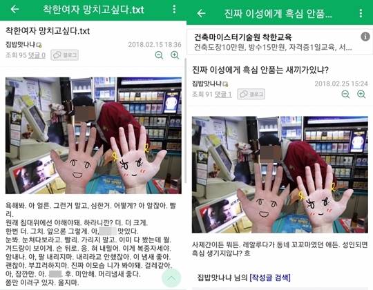 문제는 그가 남긴 게시물들의 내용이다. 전 연령대 이용자가 볼 수 있는 게시판에 성관계와 관련한 음담패설을 숱하게 남겼다. 이를테면 ‘착한 여자 망치고 싶다’는 제목의 글에서는 여성을 복종시키며 변태적인 성관계를 하는 상황을 상세하게 묘사했다.