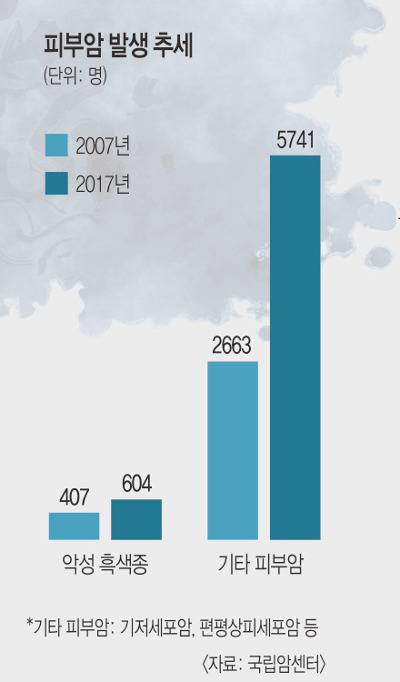 그런데 근래 한국인에게도 피부암 발생이 꾸준히 느는 추세다. 피부암 환자는 2007년 3070명에서 2017년 6345명으로 10년 사이 배 이상 증가했다. 피부암 유형 중 예후가 나쁜 악성 흑색종은 같은 기간 약 48%(407명→604명), 기타 피부암(기저세포암, 편평상피세포암 등)도 2.15배(2663명→5741명) 늘었다.