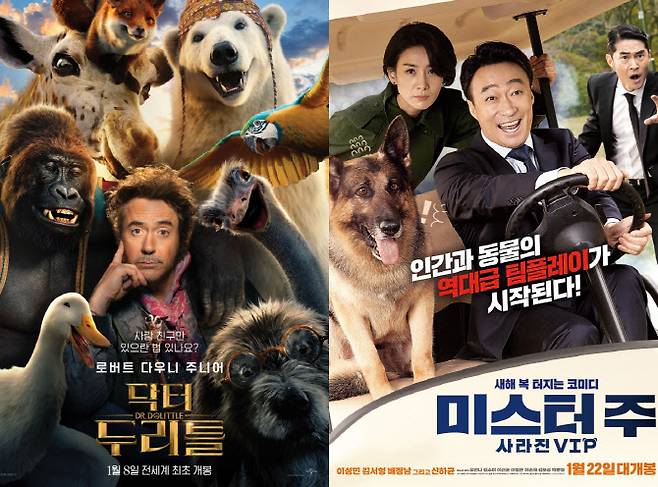 지난 8일 개봉해 150만명 이상의 관객을 동원한 로버트 다우니 주니어 주연의 할리우드 영화 '닥터 두리틀'(감독 스티븐 개건)과 22일 개봉한 이성민 주연의 한국영화 '미스터 주:사라진 VIP'(감독 김태윤)가 그것.