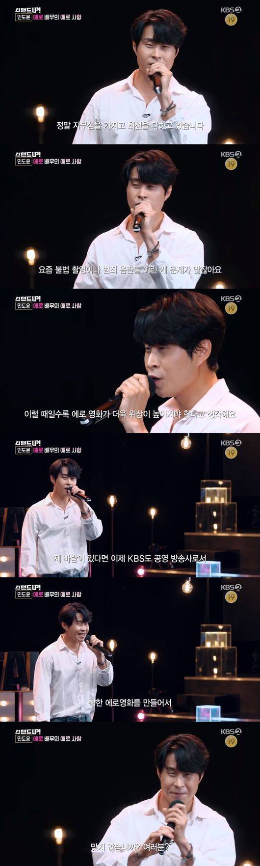 민도윤은 "기술적인 테크닉도 있지만 중요한 건 교감이다"라며 "에로 영화를 본다는 건 건강하다는 지표다. 내 바람이 있다면 KBS도 착한 에로 영화를 만들었으면 좋겠다. 만약에 만든다면 제목은 '스탠드업'으로 가고 배우는 내가 출연했으면 좋겠다"라고 말해 박수를 받았다.