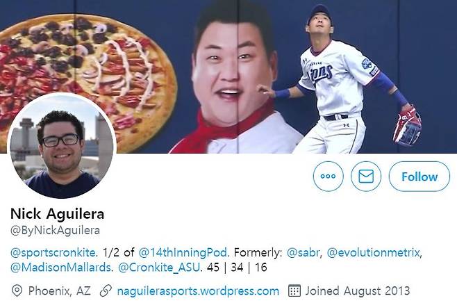 개그맨 김준현은 월드스타다. 미국 크론카이트 뉴스 닉 아길레라 기자는 5일 KBO리그 중계를 본 소감 가운데 하나로 "피자 가이"를 꼽았다. 삼성라이온즈파크 외야에 붙은 광고 얘기였다. 그는 트위터 프로필 배경화면을 김준현의 사진으로 바꿀 만큼 이 광고에 큰 감동을 받았다. 아길레라 기자뿐만 아니라 많은 미국 야구 팬들이 "저 광고 뭐야"하며 놀랐다.
