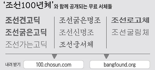 조선일보는 아름다운 글자를 널리 나눈다는 취지에서 '조선100년체'뿐만 아니라 기존에 개발해 사용 중인 조선굵은명조, 조선굵은고딕, 조선로고체, 조선굴림체, 조선신명조, 조선가는고딕, 조선궁서체, 조선견고딕 8종의 서체도 무료로 배포하기로 했다.