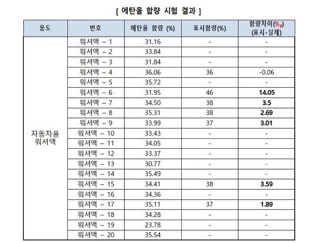 에탄올 함량을 표시한 7개 제품 중 불스원레인OK그린워셔 정도가 표시 함량과 실제 함량이 일치했다. 소비자원은 표시기준 부적합 제품에 대해 개선을 권고했으며, 지속적 관리감독할 예정이다.