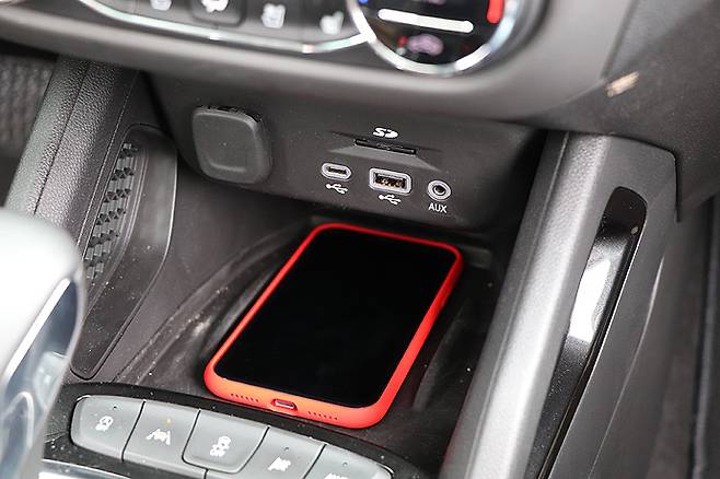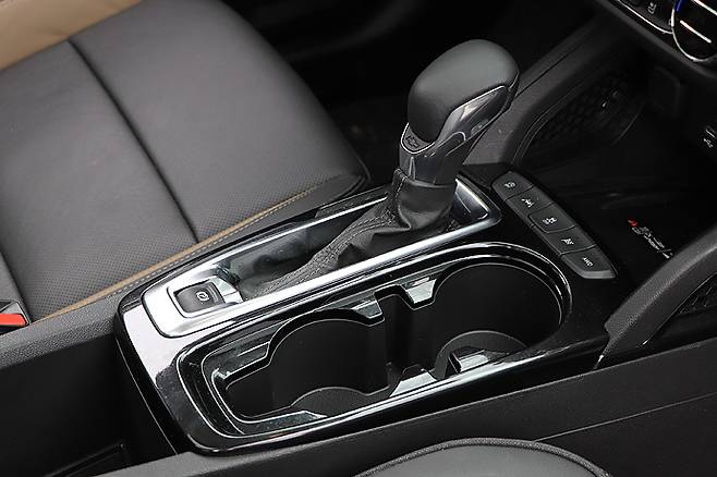 부츠 타입의 실렉터 레버 앞쪽에는 무선 스마트폰 충전 패드가 있다. 그 옆의 컵 홀더의 크기가 작은 것은 이 차가 미국보다는 한국인 디자이너의 손길이 더 많이 갔다는 것을 보여 준다.