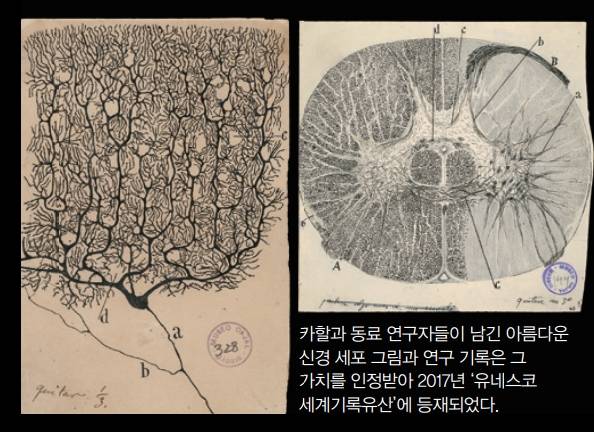 스페인의 젊은 해부학 교수 카할은 신경 구조를 연구하면서 골지의 염색법을 발전시킨 ‘급속 골지법’을 만들었습니다. 이 방법은 신경의 더 정밀한 구조도 염색할 수 있었습니다. 그는 급속 골지법으로 다양한 신경 세포를 염색하고 이를 그림으로 남겼습니다. 카할은 화가를 꿈꿨지만, 10살 때 재능이 없다는 얘기에 포기한 적이 있었습니다. 다행스럽게도 그의 재능이 신경 세포 연구에서 빛을 발했습니다.