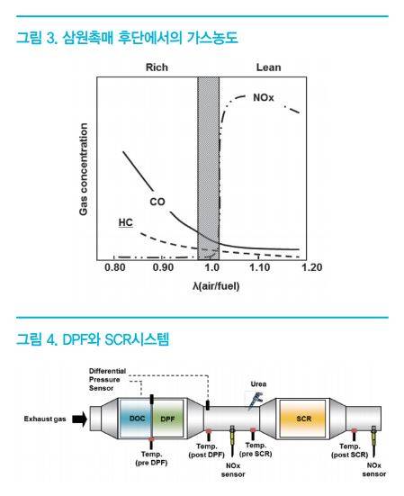 <그림 1>의 산소센서는 대기에 노출되어 있는 기준전극과 배기가스에 노출되어 있는 측정전극으로 구성되어 있으며, 양 전극의 산소농도 차이에 따라서 발생하는 전압이 출력신호가 된다. 산소센서의 출력은 <그림 2>와 같이 이론 공연비 부근에서 급격히 변화하므로, 산소센서의 출력을 Feedback하면 엔진이 이론 공연비 부근에서 연소되도록 제어할 수 있다. 이론 공연비 부근에서 연소된 배기가스가 삼원촉매를 통과하면 <그림 3>과 같이, 여러 유해가스의 농도가 대부분 저감된다. 그러나 디젤엔진과 같이 연료가 희박한 조건에서 연소되면 삼원촉매의 질소산화물 저감효율이 크게 저하한다.