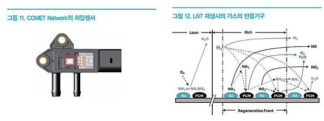 또한 배기가스 후처리 시스템에는 NOx센서 이외에 NH3센서도 요구될 것이다. SCR시스템에서 NH3는 NOx보다 유해한 물질이므로, SCR 후단에서 NH3 농도를 측정하여 SCR의 정상작동여부를 지속적으로 확인하여야 한다. LNT에서는 재생시에 NOx가 변환되어 생성되는 NH3가 환원에 사용되지 않고 방출될 수 있으므로, 이를 측정하여 NH3가 방출되는 것을 최소화하거나 혹은 생성된 NH3를 활용하는 새로운 후처리 시스템을 구성하는 데에 NH3 센서가 적용될 수 있다<그림 12>.