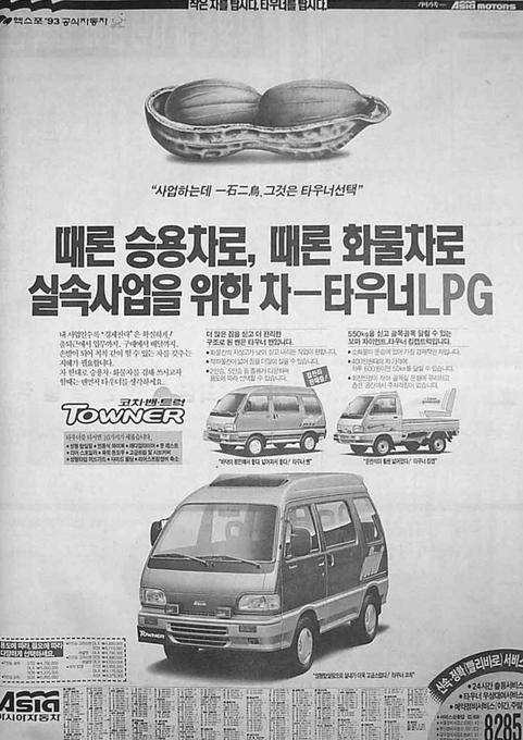 舊 아시아자동차는 1999년 기아자동차에 완전히 흡수 합병되기까지 주로 대형 상용차를 중심으로 사업을 전개해 왔다. 하지만 1991년 등장한 대우국민차의 다마스와 라보가 영세 상공업자를 중심으로 상당한 호응을 얻는 것을 지켜 본 아시아자동차는 경상용차의 가능성에 주목하기 시작했다. 그리고 다마스와 라보가 등장한 이듬해인 1992년, 대한민국의 두 번째 경상용차 모델, 타우너 시리즈를 내놓았다.