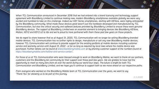 TCL은 "8월31일부터 블랙베리 브랜드의 모바일 기기를 판매할 수 없게 된 것에 대해 유감스럽게 생각하며 2022년 8월31일까지 모바일 기기 구입자들에게 서비스와 보증 지원을 이어갈 것"이라며 "블랙베리 모바일과 함께 일할 수 있었던 것은 TCL에게 큰 축복이었고 더 많은 각지의 팬들과 만날 수 있어 고객, 파트너들에게 감사다는 말을 전하고 싶다"고 밝혔다.