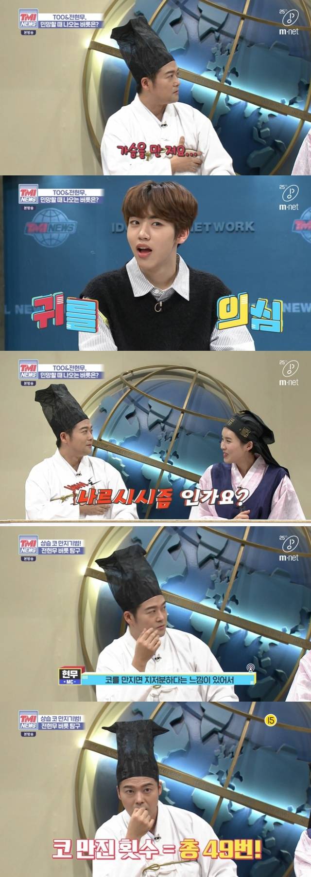 제작진이 직접 세어본 결과 전현무는 녹화 중 총 49번이나 코를 만졌다. (사진=Mnet 'TMI뉴스' 방송 캡처)