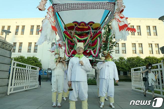 (광주=뉴스1) 허단비 기자 = 5·18민주화운동 40주년 추모제가 진행된 27일 오후 광주 동구 옛 전남도청 앞에서 상여꾼들이 상여소리 행진을 마치고 서있다.이날 옛 전남도청 일대에서 5·18부활제가 열려 5월영령을 추모하고 기리는 다양한 행사가 펼쳐졌다.2020.5.27/뉴스1