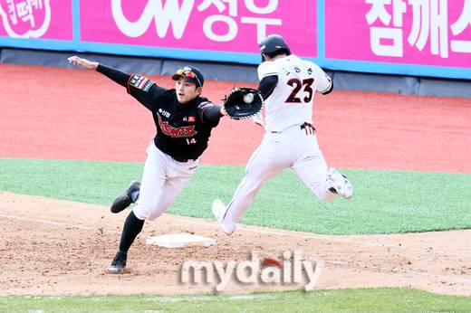 [마이데일리 = 수원 곽경훈 기자] KT 김병희가 10일 오후 경기도 수원 KT위즈파크에서 진행된 '2020 프로야구 KBO리그' KT 자체 청백전 6회말 무사 만루에서 조용호의 내야 땅볼때 1루 수비를 하고 있다.- ⓒ마이데일리(www.mydaily.co.kr). 무단전재&재배포 금지 -