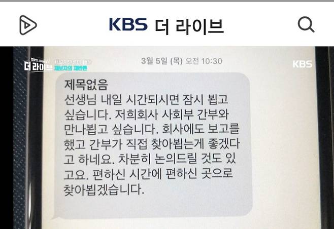 "선생님. 내일 시간되시면 잠시 뵙고 싶습니다. 저희 회사 사회부 간부와 만나 뵙고 싶습니다. 회사에도 보고를 했고, 간부가 직접 찾아 뵙는 게 좋겠다고 하네요. 차분히 논의드릴 것도 있고요. 편하신 시간에 편하신 곳으로 찾아 뵙겠습니다."