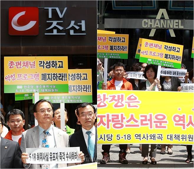 | ▲ "5.18 역사 왜곡한 TV조선·채널A 각성하라" TV조선과 채널A는 5.18 민주화항쟁 역사를 왜곡하기도 했다. 2013년 5월 30일 오후 민주당 5.18역사왜곡 대책위 소속 강기정 의원과 당원들이 '5.18 북한군 개입설'을 방송한 뒤 사과한 종편방송 'TV조선'(조선일보)과 '채널A'(동아일보) 광화문 사옥앞에서 규탄회견을 열고 해당 프로그램 폐지와 방송허가 취소 등을 촉구했다. |