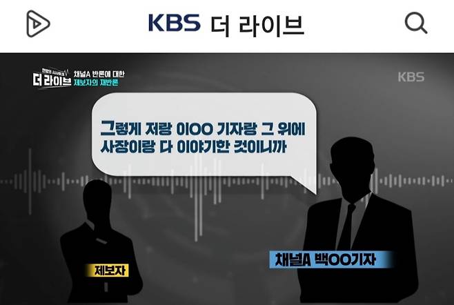 그가 공개한 녹음파일에서 채널A 백OO 기자는 "그렇게 저랑 이OO 기자랑 그 위에 사장이랑 다 이야기한 것이니까"라고 말했다. (KBS '더 라이브'는 기자 이름을 익명으로 처리).