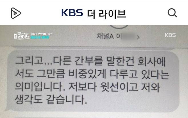| ▲ 채널A 기자가 제보자에게 보낸 문자 메시지. KBS1TV '더 라이브' 9일 방송 밤 방송화면 캡처. |