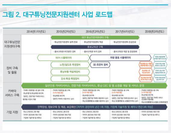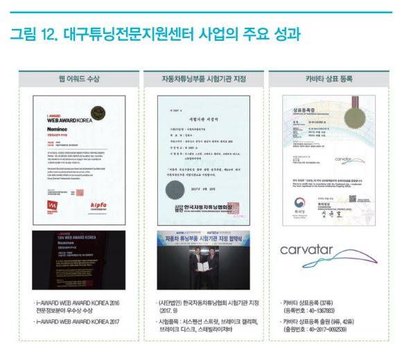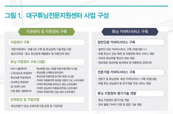 대구튜닝전문지원센터 사업은 산업통상자원부와 대구광역시의 지원으로 튜닝산업 밀착형 기업지원 및 소비자 중심의 성숙된 튜닝문화 확산을 위한 센터구축을 목표로 카바타(Car-Vatar) 및 기업지원 서비스를 제공하기 위하여 2014년부터 5년간 자동차부품연구원, 서울대학교, 국민대학교, 경북대학교, 계명대학교가 사업을 수행 중이다. 본 사업에서 대구튜닝전문지원센터 및 튜닝홍보교육관은 자동차부품연구원 대구경북본부(대구광역시 달성군 구지면 소재)에 연면적 2,627m2 (지하 1층, 지상 2층)으로 건축을 완료하였으며, 튜닝부품 데이터베이스 구축 및 튜닝업체 기술개발 지원을 위한 시험장비는 차량 풍동 시뮬레이터 등의 총 13종을 구축 중에 있다.