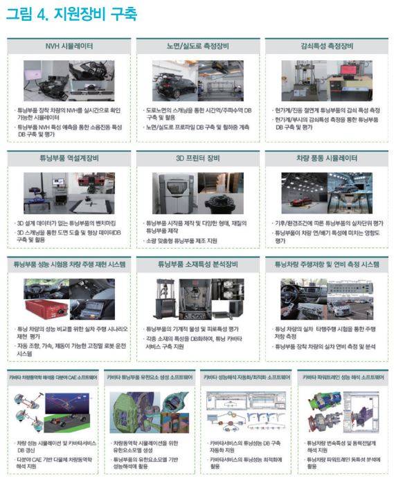 또한 본 사업에서는 튜닝전문인력 양성을 위한 튜닝카 매뉴얼 6종 구축, 교육 프로그램 50건 운영, 대학생 자작자동차 경진대회 개최 지원을 수행하고 있다. 튜닝부품 기업체 기술지원을 위해서는 구축장비 활용 시험평가 지원, 신제품 기술개발 지원, 기술정보 제공, 카바타 서비스 및 튜닝부품 데이터베이스 활용 지원 등을 통한 다양한 기업지원을 수행하고 있다.