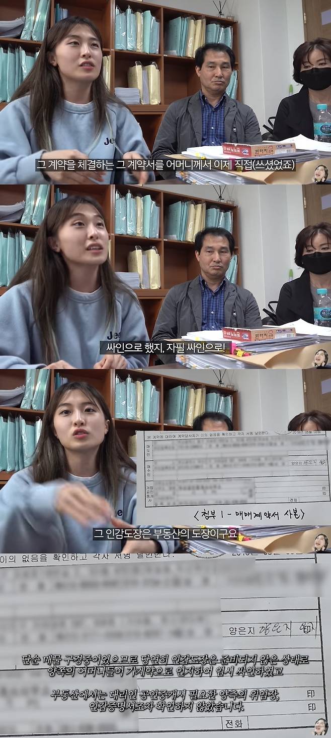 이어 "매도인과 부동산 실장, 어머니까지 셋이 남았다. 식사를 하던 어머니에게 가계약을 먼저 흥정했고 '당일 500만 원을 입금하지 않으면 계약이 파기된다'고 해서 어머니가 계약서를 썼다. 자필 싸인으로 제 이름을 적었지만 인감도장은 찍지 않았다"고 덧붙였다.