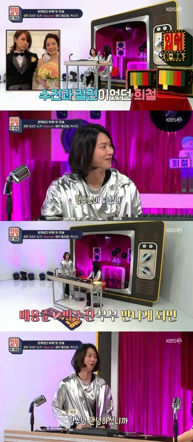 김희철은 “박수진과 드라마 상대역으로 나와 친하게 지냈는데 형수님이 되셨다. 배용준 형님 보면 ‘형수님 안녕하십니까’ 하는데 너무 오글거린다”며 “성격이 천사다. 너무 좋다”고 박수진이 착하다고 칭찬했다. (사진=KBS 2TV ‘이십세기 힛-트쏭’ 캡처)