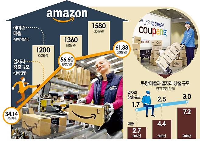 세계 최대 전자상거래업체 아마존은 한때 ‘일자리 킬러’로 불렸다. 아마존의 공격적 경영으로 ‘유통공룡’들이 무너지자 온라인 유통업이 오프라인 유통업체의 일자리를 빼앗는다는 비판이 쏟아졌다.