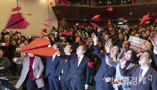 5일 국회에서 열린 미래한국당 중앙당 창당 대회에서 대표로 선출된 한선교 의원과 황교안 자유한국당 대표, 심재철 원내대표 등 참석자들이 빨간 종이비행기 날리기 퍼포먼스를 하고 있다. 미래한국당은 4.15 총선 준연동형 비례대표제가 적용됨에 따라 자유한국당이 만든 위성 정당이다./윤동주 기자 doso7@