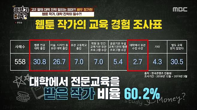 또 유명 웹툰 작가 김풍(홍대), 이말년(건국대), 무적핑크(서울대) 등도 모두 대학을 나왔다고 밝혔다.