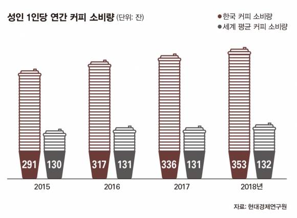 연간 마시는 커피 소비량도 꾸준히 늘고 있다. 현대경제연구원 조사에 따르면 성인 1인당 연간 커피 소비량은 2015년 291잔, 2016년 317잔, 2017년 336잔, 2018년 353잔으로 계속 증가했다. 같은 기간 세계 평균 커피 소비량이 130→131→131→132잔으로 거의 변화가 없었던 것과 뚜렷하게 비교된다.