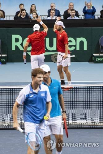 epa08276487 Oliver Marach (back R) and Juergen Melzer (back L) of Austria react during their doubles match against Ariel Behar (front L) and Pablo Cuevas (front R) of Uruguay at the Davis Cup qualifier between Austria and Uruguay in Premstaetten, near Graz, Austria, 07 March 2020. EPA/CHRISTIAN BRUNA