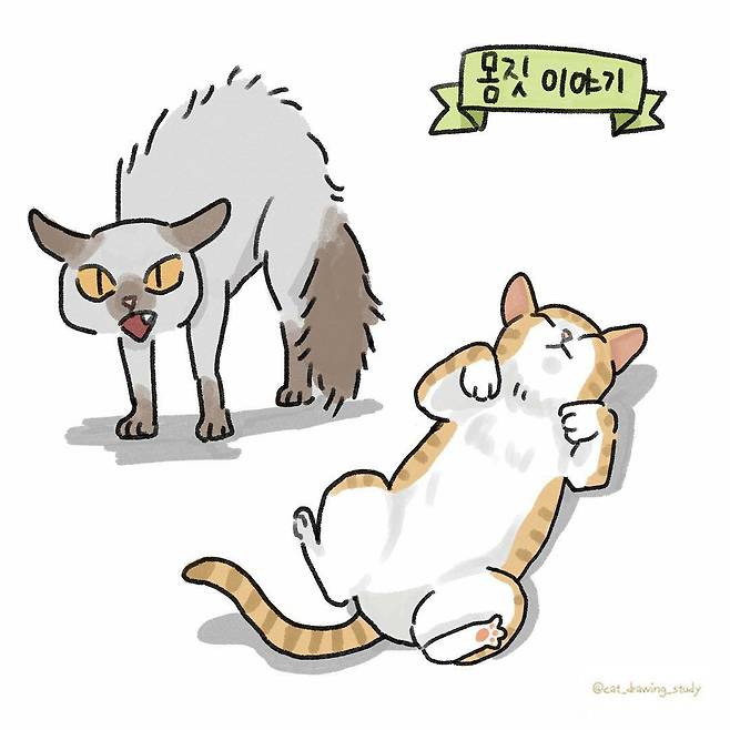 ◇고양이의 꼬리 언어 Δ꼬리가 바짝 올라갈 때 : 친근하고 만족스러운 상황으로 꼬리 끝쪽에 있는 사람이 좋다라는 의미다. Δ꼬리가 지면과 수평일 때 : 공격적이지 않고 우호적인 상황이다. Δ꼬리를 아래로 내릴 때 : 무언가에 겁을 먹고 있거나 항복하고 있다는 의미다. Δ꼬리의 털을 세울 때 : 방어 자세이면서 공격 준비를 하는 자세. 혹은 묘주가 장난감을 갖고 격하게 놀아줘서 기분이 매우 들떠 있는 상황이다. Δ꼬리를 탁탁 내려칠 때 : 흥분하거나 무언가에 화가 났을 때 반응이다. ⠀⠀⠀ ◇고양이의 귀 언어 Δ똑바로 세운 귀 : 평범한 귀모양. 느긋하고 평온할 때다. Δ납작하게 젖힌 귀 : 불안하고 겁이 날 때나 공격태세일 때다. Δ옆으로 납작하게 젖힌 귀 : 주변을 관찰하며 탐색전을 하고 있을 때다. Δ쫑긋쫑긋 움직이는 귀 : 소리를 들으며 주변 정보를 모을 때다. ⠀⠀⠀ ◇고양이의 눈 언어 Δ시선을 피함 : 고양이들은 낯선 이와 계속 눈을 마주치면 싸우자는 의미로 받아들이기 때문에 이를 피하려고 시선을 돌린다. Δ동공 확대 : 무언가에 집중해야하거나 흥분했을 때, 공포감을 느끼면 동공이 커진다. Δ동공 축소 : 주변이 너무 밝아서이며 실내에서 평소의 모습이다. Δ힘 뺀 눈 : 매우 기분이 좋은 상태로 일명 가자미 눈이라고 한다. Δ눈 깜빡대기 : 당신을 신뢰하고 있다는 의미다. ⠀⠀⠀ ◇고양이의 수염 언어 Δ편안한 수염 : 평상시 수염의 모양이다. Δ앞으로 향한 수염 : 주변이나 앞에 있는 것에 대한 호기심이 생기면 감각을 극대화하기 위해 수염을 앞으로 뻗는다. ⠀⠀⠀ ◇고양이의 행동(몸짓) 언어 Δ몸을 부풀리고 얼굴이 화난 자세 : 겁을 먹어서 굉장히 방어적이며 공격할 준비가 다 된 자세로 곧 공격할 수도 있다. Δ등을 바닥에 붙이고 나른해 하는 자세 : 매우 편안해 방어를 풀고 있는 자세로 보통 집안에 있을 때 모습이다.