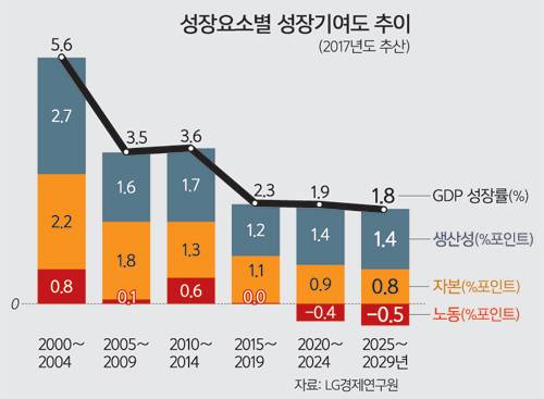 2017년 LG경제연구원이 생산연령인구 감소가 우리 경제성장률에 미치는 영향을 분석한 ‘생산가능인구 감소 시대의 경제성장과 노동시장’ 자료에 따르면 노동투입에 따른 경제성장률 기여도는 올해부터 ‘마이너스’ 효과를 낼 것으로 전망됐다.