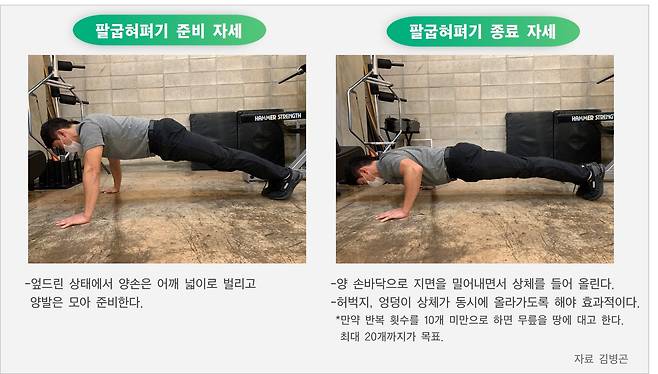 운동을 중단해 저하된 근지구력과 근력을 향상하기 위해서는 약 6주의 시간이 걸린다. 또 운동을 장시간 중단하면 불면증, 두통, 불안감, 식욕저하, 심리적 불안으로 인한 정신적 문제 등이 나타난다. 집에서 할 수 있는 근지구력 운동과 심폐 지구력 훈련을 찾아서 틈틈이 해야 체력 저하를 막을 수 있다. 이제부터라도 집에서 조금씩 아래의 트레이닝을 따라 해 보자. 힘들지만 건강을 스스로 지킬 수 있을 것이다.