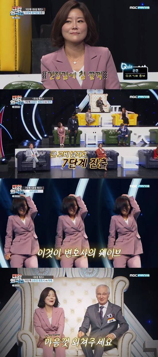 이어 신유진 변호사는 '초성퀴즈'를 만났다. 1단계 국수 문제에서 다니엘을 어렵게 꺾었지만 2단계 커피 자판기, 3단계 과일, 4단계 속담에서 안젤리나, 이렘, 모에카를 손 쉽게 꺾고 정답을 맞췄다. 5단계 운전 문제에서는 '안전거리 확보'를 맞추며 샘 오취리를 꺾었고, 6단계 'ㅇㄱㅅ' 단어에에서는 크리스 존슨을 이겼다. 7단계 속담 문제마저도 '적반하장' 사자성어를 맞추며 럭키를 물리쳤다.