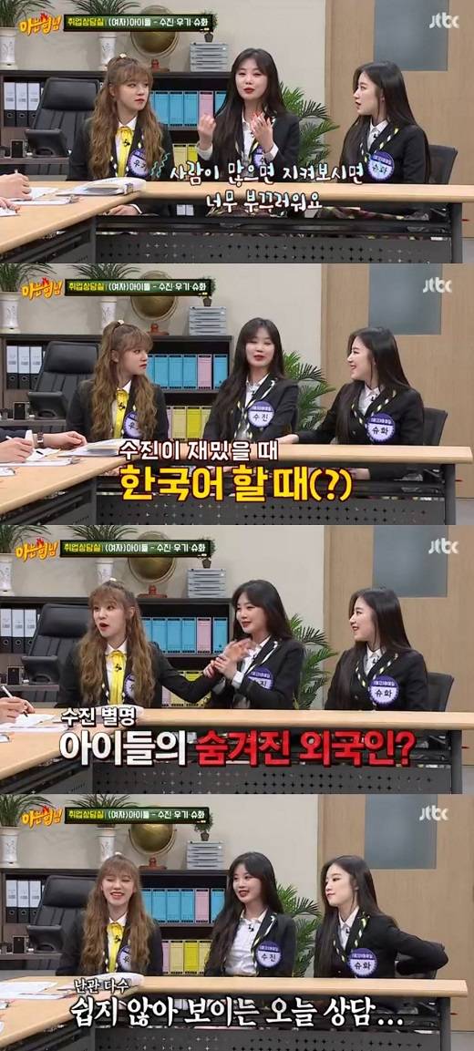 11일 오후 방송된 종합편성채널 JTBC '아는 형님'의 '취업상담실' 코너에는 (여자)아이들 수진, 슈화, 우기가 스페셜 게스트로 출연했다.