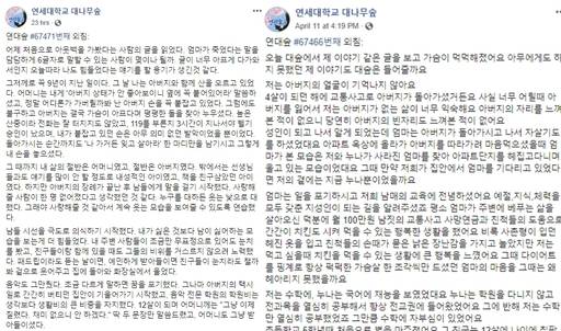 이들 글을 쓴 이들은 각각 원글(#67450번째 글)의 지은이와 마찬가지로 어렸을 적 생활고와 더불어 불우했던 가정사를 털어놨다. 두 사람은 아버지를 먼저 떠나 보낸 악조건에도 공부를 지속해 연세대에 입학했던 사연을 털어놔 다시금 구성원들의 큰 호응을 끌어냈다.