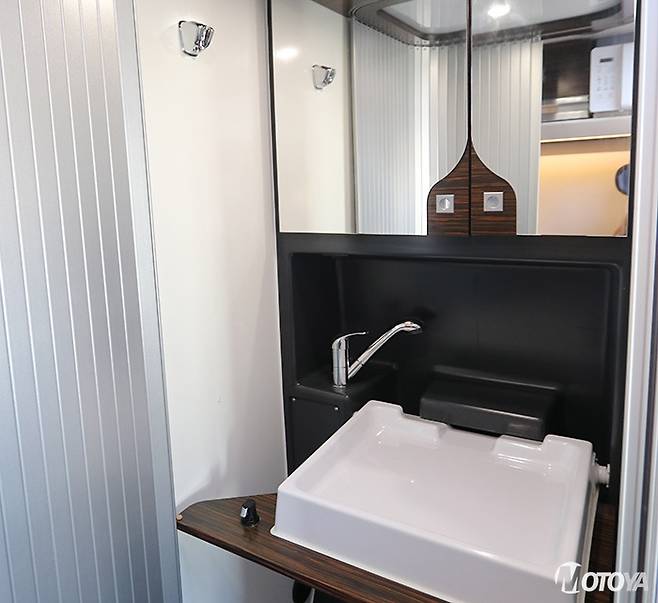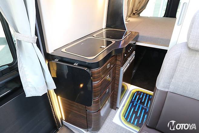 그리고 마지막으로 쏠라티 캠핑카의 주방 및 욕실 공간은 가변형 공간 설계의 절정이라 할 수 있다. 쏠라티 캠핑카의 주방과 욕실 공간은 필요할 때마다 간단하게 전환시킬 수 있다. 이는 지금까지의 국산 캠핑카에서는 볼 수 없었던 완성도 높은 레벨의 가변형 공간 구조다. 가변식의 공간 구조는 종래의 국산 캠핑카들 중에도 종종 나타나는 방식이기는 하다. 그렇지만, 그 구조가 조악하고 변환 방식도 복잡한 데다, 기밀 유지는 아예 기대할 수 없는 수준이었다. 하지만 쏠라티 캠핑카의 공간 변환은 유럽식의 '탬버도어'를 이용하여 '간단한 변환'과 '신뢰성', 그리고 '기밀 유지'라는 세 마리 토끼를 잡았다. 탬버도어는 셔터형으로 만들어진 도어로, 가벼운 중량은 물론, 공간도 적게 차지하면서 수밀성까지 갖춰, 유럽의 모터홈에 널리 사용되고 있는 방식의 도어다.