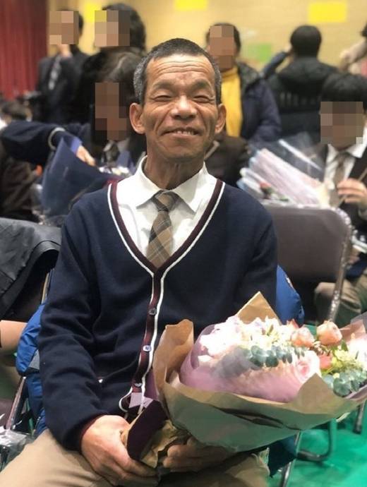 사진에는 깔끔하게 교복을 차려입은 엄기봉 씨가 졸업식에서 꽃다발을 품에 안고 환한 미소를 짓고 있다.