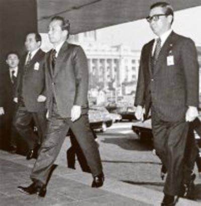 | ▲ 박정희(중앙)와 김재규(오른쪽), 그리고 차지철(왼족) |