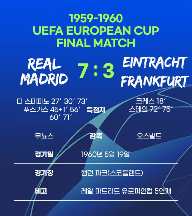 이렇게 1959-1960 유로피언컵은 레알 마드리드와 아인트라흐트 프랑크푸르트의 대결로 압축됐다. 이미 대회 4연패를 기록 중이던 레알 마드리드와 서독 축구의 자존심을 앞세운 아인트라흐트 프랑크푸르트의 승부는 보는 이들을 기대케 만들었다. 그러나 결승전은, 생각보다 너무나 일방적으로 진행됐다.