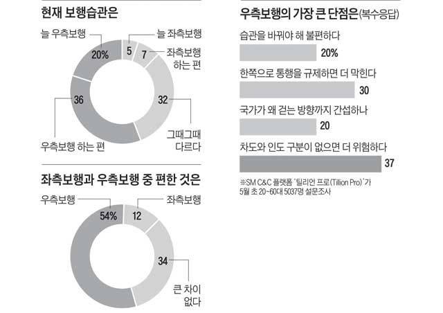 이번 설문조사에서는 우측 보행의 장단점(복수 응답)도 물었다. '차량을 마주 보고 걸어 안전하다'(37%) '오른손에 든 짐끼리 충돌하지 않는다'(31%) '횡단보도에서 더 안전하다'(24%) '일제 잔재 청산'(15%) 등이 장점으로 꼽혔다. 응답자 중 76%는 오른손잡이였다. 우측 보행의 가장 큰 단점은 '차도와 인도 구분이 없으면 더 위험하다'(37%)였다. '한쪽으로 통행을 규제하면 더 막힌다'(30%) '국가가 왜 걷는 방향까지 간섭하나'(20%) '습관을 바꿔야 해 불편하다'(20%) 순이었다.