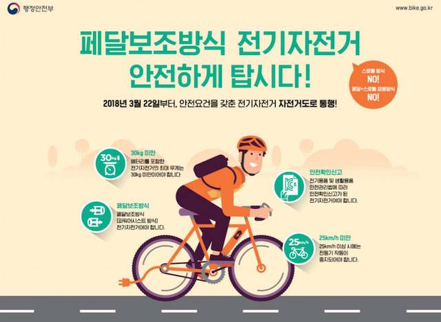 이중 자전거 전용 도로를 달릴 수 있는 '전기 자전거'는 한정적이다. 일단 PAS 방식으로 한정한다. PAS와 스로틀이 함께 있는 혼합형은 '전기 자전거'에 포함되지 않는다. 여기에 속도는 25km/h를 넘어서는 안 되며 20km/h 이상에서는 전동기의 동작이 멈춰야 한다. 무게는 30km 미만으로 전기용품 및 생활용품 안전관리법에 따라 '안전 확인 신고'를 얻어야 한다.