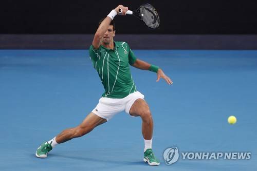 epa08177796 Novak Djokovic of Serbia in action during his men's singles semifinal match against Roger Federer of Switzerland at the Australian Open Grand Slam tennis tournament in Melbourne, Australia, 30 January 2020. EPA/ROMAN PILIPEY