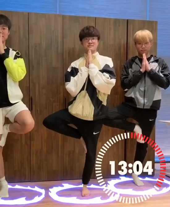 T1 소속 롤 프로게이머 페이커, 테디, 칸나가 요가 20초 챌린지를 성공했다.