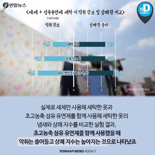 실제로 세제만 사용해 세탁한 옷과 초고농축 섬유 유연제를 함께 사용해 세탁한 옷의 냄새와 상쾌 지수를 비교한 실험 결과, 초고농축 섬유 유연제를 함께 사용했을 때 악취는 줄어들고 상쾌 지수는 높아지는 것으로 나타났습니다.