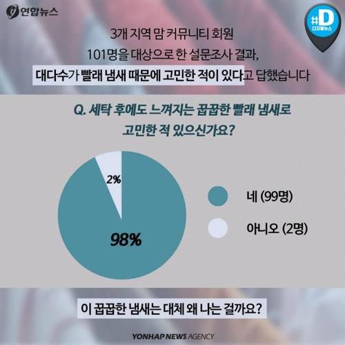 3개 지역 맘 커뮤니티 회원 101명을 대상으로 한 설문조사 결과, 대다수가 빨래 냄새 때문에 고민한 적이 있다고 답했습니다.