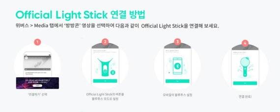 위버스를 통한 응원봉 연결법은 간단하다. 위버스 ‘미디어’ 탭에서 ‘방방콘’ 영상을 재생한 뒤 영상 아래에 위치한 ‘연결하기’ 배너를 클릭하고, 응원봉 손잡이 버튼을 블루투스 모드로 설정해 모바일과 연결하면 공연 영상과 연동되는 응원봉의 빛 변화를 확인할 수 있다. 응원봉 연결은 방탄소년단 공식 응원봉 3번째 버전(BTS OFFICIAL LIGHT STICK VER.3)과 MAP OF THE SOUL SPECIAL EDITION을 통해 가능하다.
