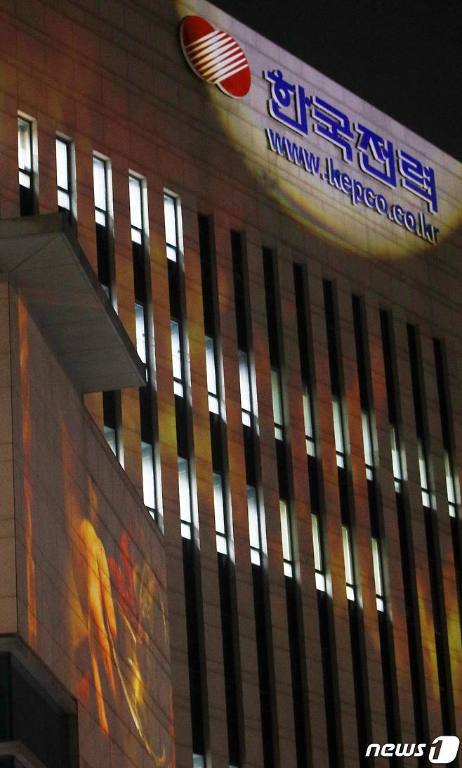 국제환경단체 그린피스 활동가들이 21일 오후 서울 서초구 한국전력 서초지사 외벽에 호주 산불 영상을 투사하며 해외석탄 투자 중단을 촉구하고 있다.